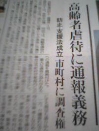 【高齢者虐待に通報義務/防止・支援法成立 市町村に調査権】 ■高齢者虐待防止・養護者支援法が1日、参院本会議で全会一致で可決、成立した。介 護が必要になっても尊厳ある老後を送れるようにするため、虐待の通報義務や虐待を 受けた高齢者の保護規定などを盛り込んでいる。施行は来年4月1日。 ▲これで児童虐待・DVに続き高齢者の虐待防止法が成立したことになります。二者 と異なり、高齢者虐待は施設や自宅など閉鎖的な場所で起きるため、外部の目が入る ような法制度になることが望まれます。 ━━━━━━━━━━━━━━━━━━━━━ +++『社会保障ニュース』編集室+++本部 http://plaza.rakuten.co.jp/socialsecurity/ ※リンク生成されない場合はアドレスバーに コピペしてください。 ━━━━━━━━━━━━━━━━━━━━━  |