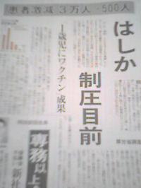 【はしか制圧目前/患者激減3万人→500人/「1歳児にワクチン」成果】 ■はしか(麻疹)にかかる子どもが激減していることが、厚生労働省の全国調査でわか った。2001年には約3万4000人の患者が報告されていたが、昨年から急減、今年は10月 半ばまでの報告数が、01年の同時期と比べ約60分の1に減った。1歳児へのワクチン接 種が広がった成果とみられ、小児科医の長年の悲願だったはしかの制圧が、ついに視 野に入った。 ━━━━━━━━━━━━━━━━━━━━━ +++『社会保障ニュース』編集室+++本部 http://plaza.rakuten.co.jp/socialsecurity/ ※リンク生成されない場合はアドレスバーに コピペしてください。 ━━━━━━━━━━━━━━━━━━━━━  |