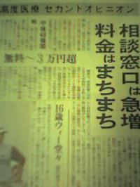 【高度医療セカンドオピニオン/相談窓口は急増 料金はまちまち/中核48機関 無料 〜3万円超】 ■がんなど重大な病気の治療に際し、患者が主治医以外の別の専門医の意見を聞く「 セカンドオピニオン」の専門外来を設ける病院が急速に増えており、費用は3万円以上 から、無料まで大きな差がある現状が、読売新聞の調査でわかった。 ▲セカンドオピニオンという言葉は、もうかなり浸透してきたと思います。専門外来 を設ける病院も増えてきたみたいですが、その料金にかなり差があるのには驚きでし た。料金の差は医療機関の方針によるもので、まだ相談内容に差があるとは思えませ んが、金の有無で生死に関わる情報が左右されるのは問題だと思います。 ━━━━━━━━━━━━━━━━━━━━━ +++『社会保障ニュース』編集室+++本部 http://plaza.rakuten.co.jp/socialsecurity/ ━━━━━━━━━━━━━━━━━━━━━ |
