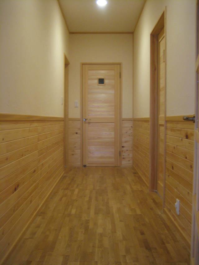色は壁は薄いクリームで、天井は白色でこれは原色だそうです。ふと照明をつけたら良い感じの廊下になりました。建具はもちろん大樹のヒノキ仕様です。