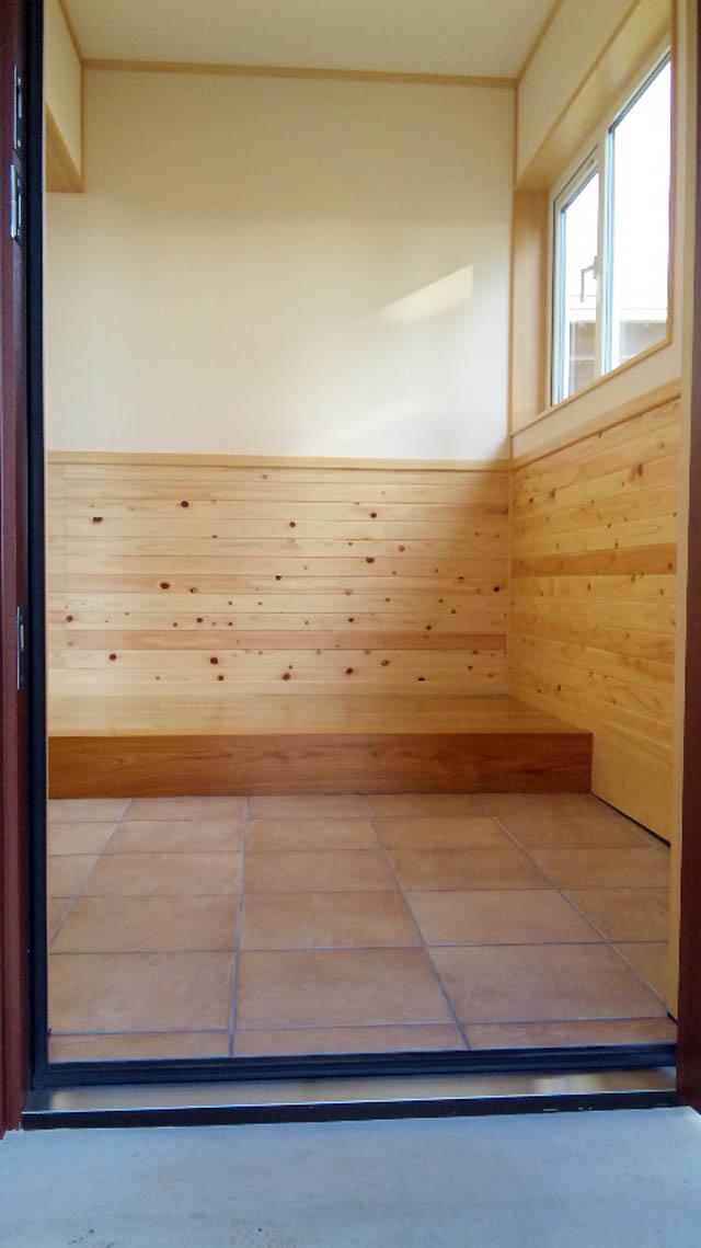 床は見えませんが無垢材のナラ、上がり框は木工房大樹から仕入れた欅で、腰壁はヒノキでその上はテラ、デコールです。