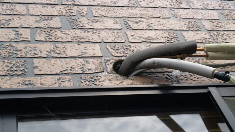 エアコンのつけ方こういう風にただ穴を開けて配管すると雨漏り、断熱欠損、など起こりやすいので穴の隙間はしっかりふさいでから、配管カバーをやってもらいましょう、