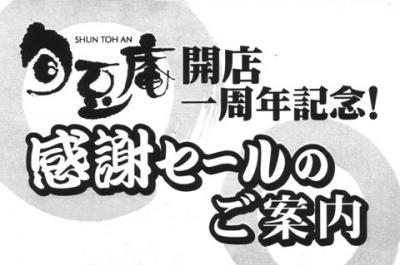 日頃は当店をご利用下さいまして誠に有り難く厚く御礼申し上げます。 お陰様で「旬豆庵」開店一周年となりました。 つきましては謝恩の意味をこめまして『一周年記念感謝セール』を開催いたします。お得な商品をはじめ、季節の素材を使った商品などたくさん取り揃えておりますので、ぜひこの機会をお見逃しのないようご利用賜りたく、心よりご案内申し上げます。 開催期間:平成18年7月1日(土)〜7月31日(月)まで 旬豆庵への地図はこちら |