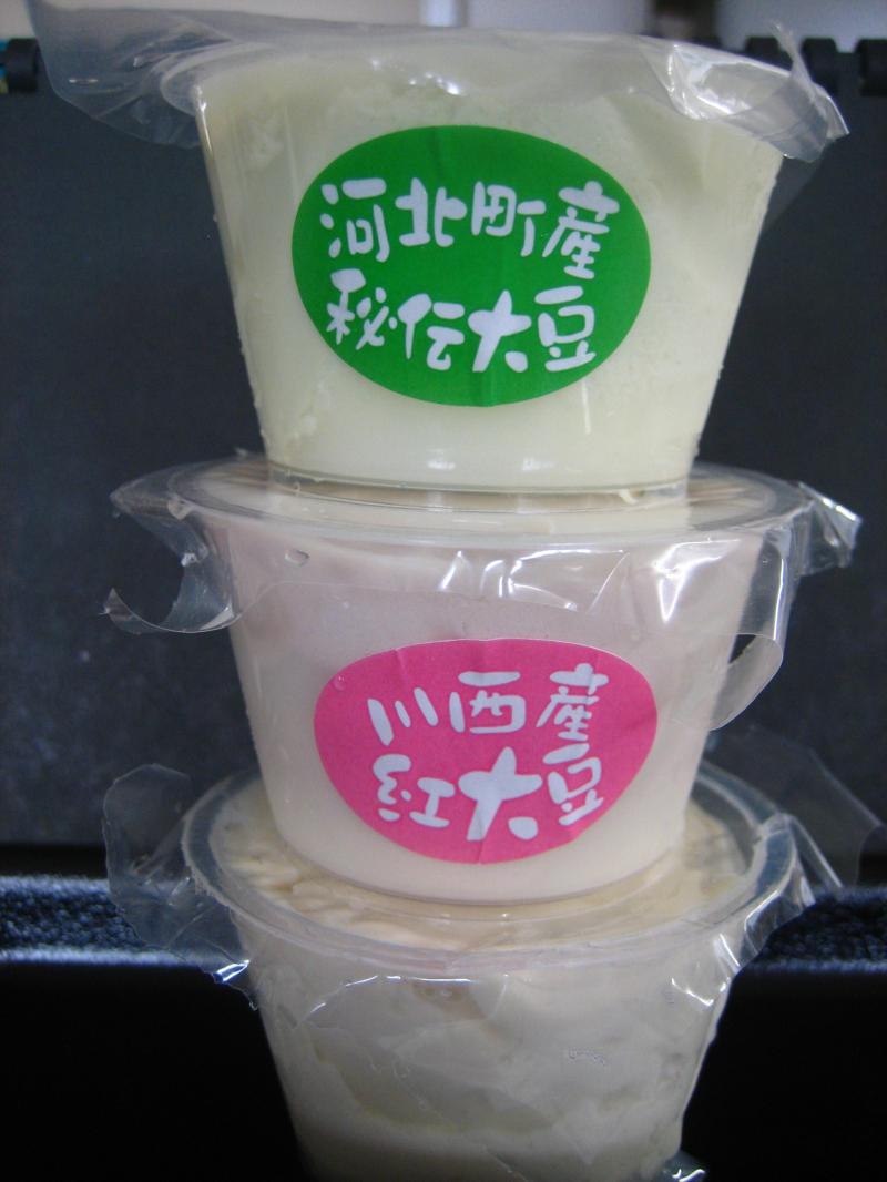 山形産大豆、山形産秘伝大豆、川西町産紅大豆の三色のお豆腐がセットになって新発売。