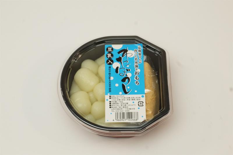 豆腐屋さんが作った不思議なおもち、豆乳入りのわらびもちです。中に入っているきな粉と黒蜜を付けてお召し上がりください。もちもちとした食感が食べやすいのでお子様にも大人気の商品です。