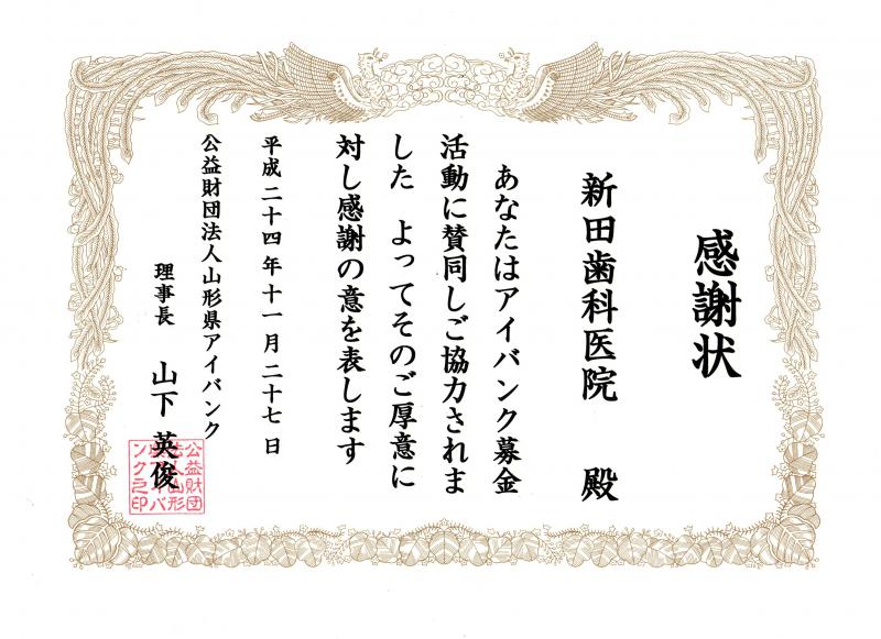 院内で、財団法人山形県アイバンクへの募金活動を行い、感謝状をいただきました!