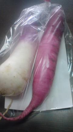 「最上かぶ」と、「最上赤長かぶ」を各1本袋詰めし、