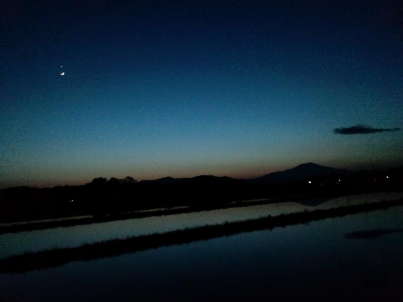 田んぼの水回りをしていると、月と金星と鳥海山。