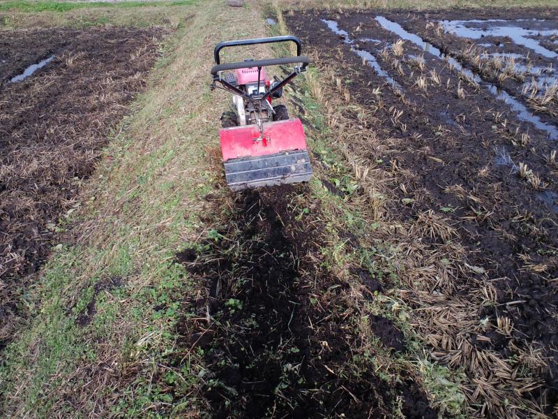 畔の上を、ミニ耕転機で耕しています。