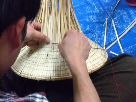 スゲの選別調製から祭り笠(φ34cm)の骨笠を使って各工程を実習します。