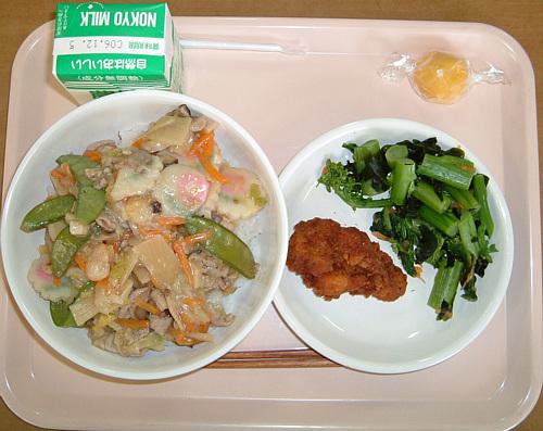 献立は、中華丼、フライドチキン、アスパラ菜のおひたし、牛乳です。