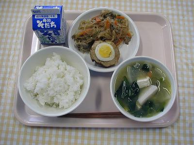 献立は、ごはん、スコッチエッグ、春雨炒め、みそけんちん、牛乳です。