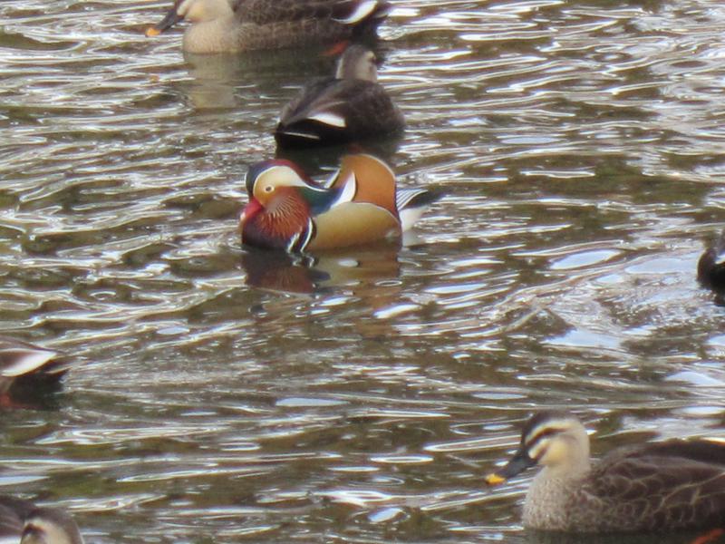 神社の池の方を見ながら帰ると、そこには一羽だけ(おしどり)が・・・