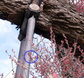 今日は、ひとつだけ咲いている個所も撮影してみました。高い枝にあるので、小さく見づらいですが、写真の青い円で囲んだ部分がそうです。鉄の支柱のそばは暖かいので他のつぼみより早く咲いたのだと思います。