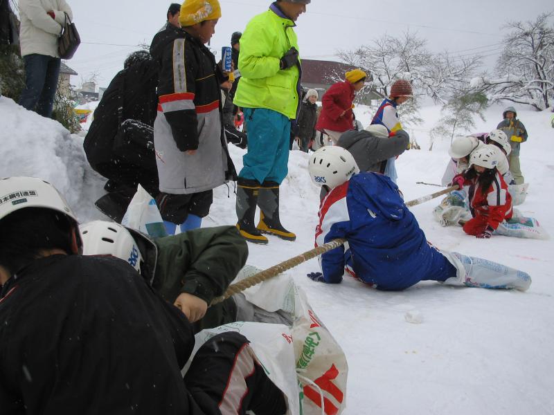 そしておばなざわの雪まつりといえば、なんといっても雪上綱引き大会です。雪上綱引きとは、靴の上にビニール袋を被せて対戦する綱引きで、試合に臨む選手達は雪に足をとられての対戦となり、観客席からの声援に応えて綱を引くわけですが、なかなか思うように引けないところがなんとももどかしく可笑しい綱引きで、例年笑いの絶えない対戦になります。子供たちの参加が多いことでも人気の程が伺えます。