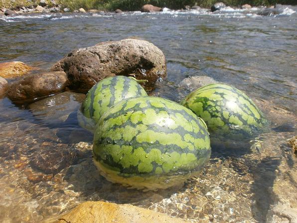 尾花沢のすいかをつめたーい丹生川の清流で冷やしていただく。