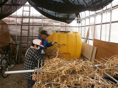 写真は乾燥させた豆を叩きつけ収穫しているところです。