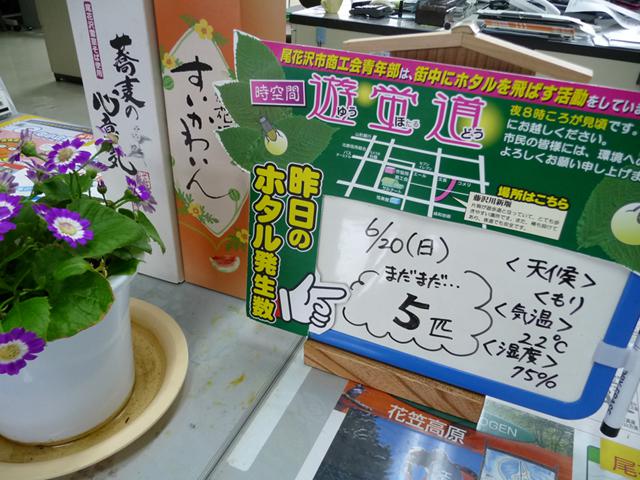ホタルの発生状況については、青年部員の各事業所に写真のようなボードを設置し、前日の結果をご来店いただいた皆様にお知らせしています。