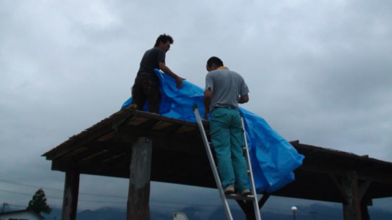 雨ということもあり、なんと!犬猿の仲の電気屋部隊が協力して!?ブルーシート張ってます!!