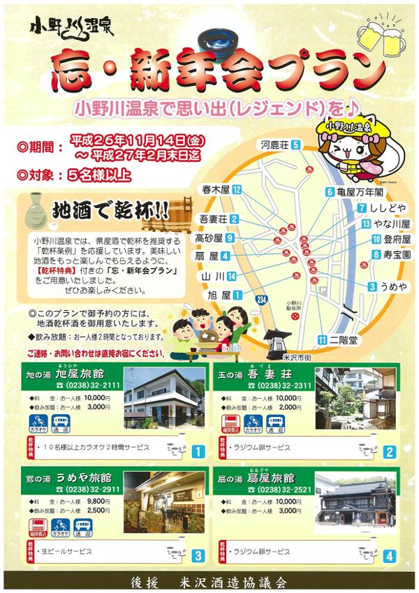 期間:平成26年11月14日(金)〜平成27年2月末日迄対象:5名様以上小野川温泉では、県産酒で乾杯を推奨する「乾杯条例」を応援しています。美味しい地酒をもっと楽しんでもらえるように、【乾杯特典】付きの「忘・新年会プラン」をご用意いたしました。ぜひお楽しみください。◎このプランでご予約の方には、地酒乾杯酒をご用意いたします。◆飲み放題:お一人様2時間となっております。※お問い合わせは直接お宿にご連絡をお願いいたします。[画像]