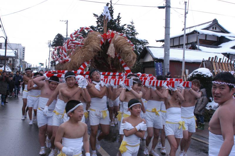 下帯姿の若者たちが、竜寿院に奉納されている長さ3,5mの大ワラジをかつぎ、町内を練り歩く伝統行事。人々からの清めの水を掛けられ歓声が上がる様子は圧巻。(高畠町商工観光課)