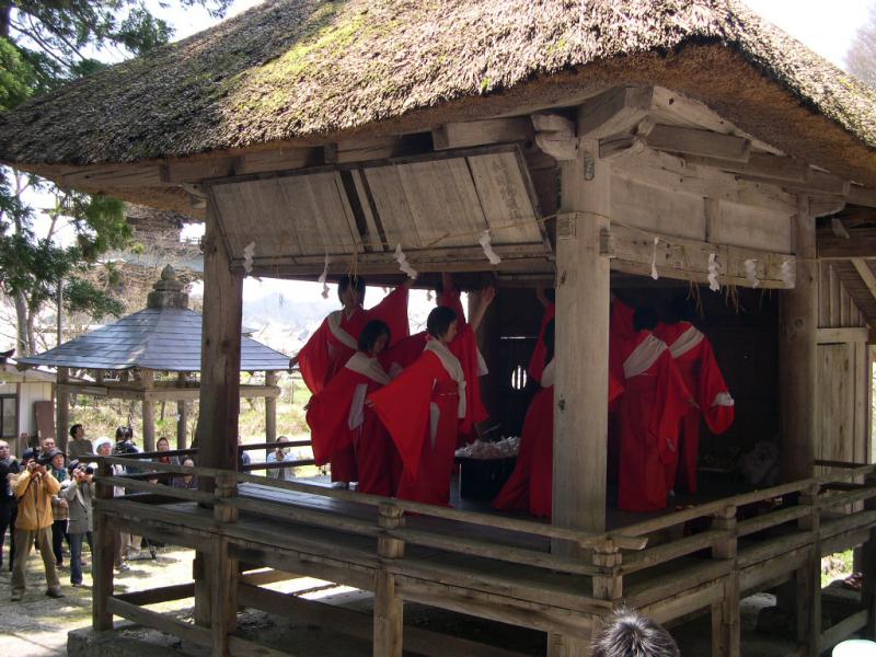 舞楽殿は、室町末期のものといわれ、方一間宝形造、茅葺きである。毎年5月3日には倭(やまと)舞、9月15日には延年の舞が気品高く、古式豊かに舞われる。本殿は、三間社流造、茅葺きである。