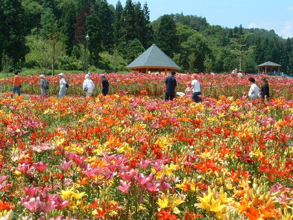 飯豊町のどんでん平ゆり園は東日本最大級のゆり園で、7ha(東京ドーム約4個分以上)の広大な敷地に150品種約50万本のゆりが咲き競う美しい花園です。開園期間は6月中旬から7月の下旬となってます。
