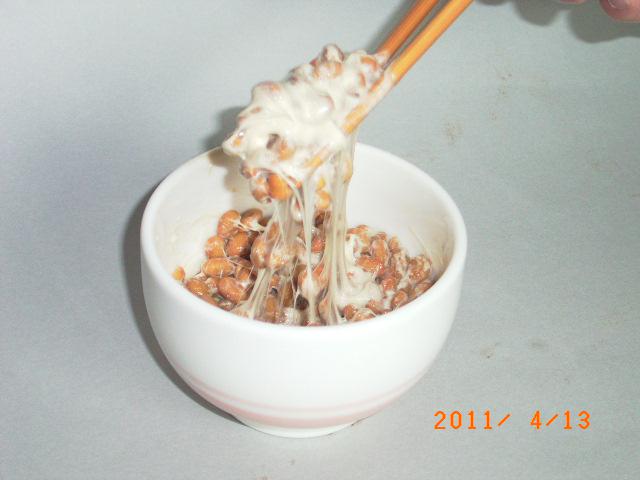 この練り方がまずいと、納豆の味が出ない。 納豆を器に出して、それに何も加えないで、そのまま,2本の箸でよく練り混ぜる。そうすると、納豆の糸が多くなる。