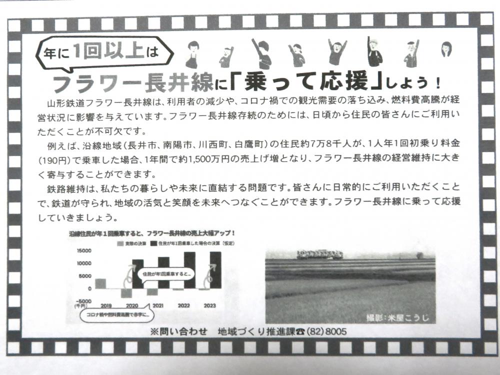 住民が駅との関わりがあるのか、行政職員が存続に必死なのか、鉄道会社が地域と共に歩む意識があるか。この点から言えばフラワー長井線には明るい基盤があるような気がする。先日の市報に「圏域住民が一年に一度列車に乗れば・・・」という記事が載っていた。鉄道写真家・故広田泉さんは「地元の人に愛されないローカル線は生き残れない」「あなた達はここで生きる覚悟はあるのか?」と語っていました。