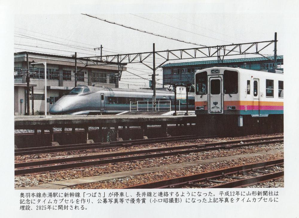 10月13日の地元紙に「タイムカプセル開封」の記事が掲載された。20世紀の最後の年に「今、21世紀に伝えたいもの」と題して、県民から募集した宝物を納めていたものを、25年経った今年、開封したものである。テレビでは開封するシーンが放映されたが、その中に映っていたのが、上の写真であった。長井市役所職員として山形鉄道㈱の設立に携わり、退職してからは羽前成田駅協力会の事務局として永く交通問題に携わられた故小口昭さんの作品である。小口昭さんの作品はこちらからご覧ください。