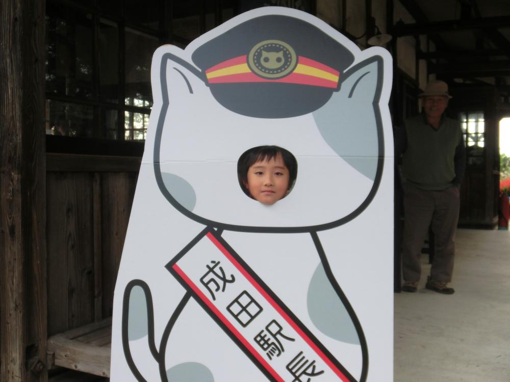 【2013年10月19日】 長井線100周年の長井線祭りに、初めて協賛芋煮会を開催しました。この時に、段ボール製の蒸気機関車と顔出しパネル(上の写真参照)を制作しました。今年、成田(ニャリタ)駅長が10年振りに復活します。