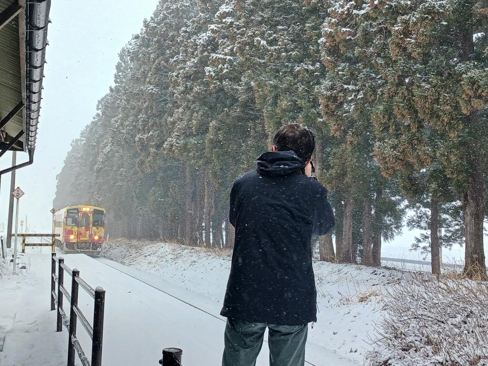 【おらだの会】3月8日、昨夜からの風雪によって、雪景色に逆戻り。時折強風が吹く中で、米屋こうじさんがカメラを構えていました。100歳の駅舎のホームに立って、一年の過ぎゆく季節を惜しむかのようだ。