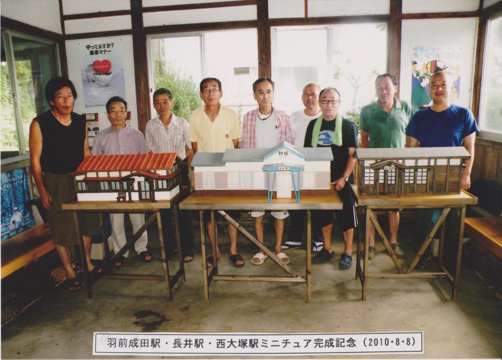 そんな時、おらだの会の初代会長であった石塚さんが成田駅、長井駅、西大塚駅のミニチュアを制作しました。平成22年(2010年)のことです。「何かやってみよう。」といった気運がおらだの会の中でも生まれていたのかもしれません。このミニチュアが会員の心に火を点けたのでしょうか。ミニチュアが本物になり、実物大の駅舎の再現に取り組むことになったのでした。おらだの会にとってもまた成田駅にとっても大きな転換点となったのでした。