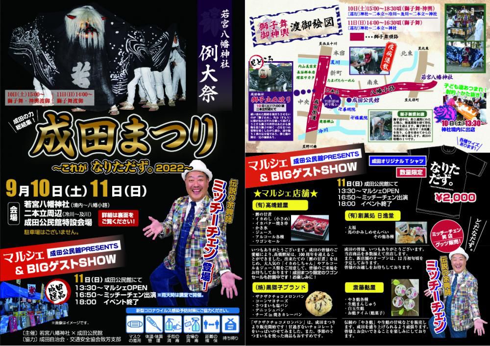 祭礼のチラシが全戸に配布された。コロナ禍での実施についてはまだまだ不安な状況が続いている中で、地域の伝統を守り地元を盛り上げようとする若者たちの姿が見えてくるようである。おらだの会では9月9日(金)から、「写真撮りツアー」参加者の作品を中心にして『まつりの記憶』と題した写真展を開催する予定です。どうぞご覧ください。また成田八幡神社の獅子舞の様子はユーチューブ等にアップされていますので検索してみてください。