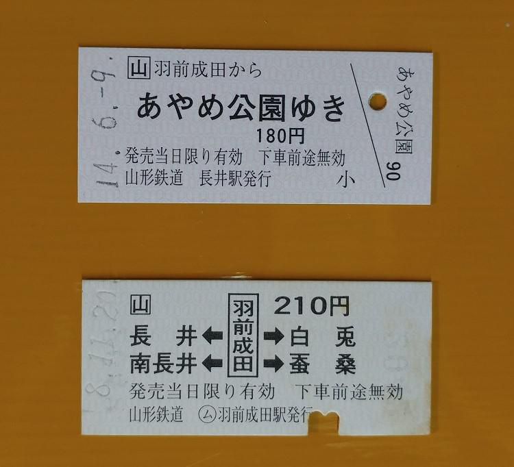 「約25年前の平成8年、米坂線から荒砥→長井→羽前成田→宮内→西大塚→赤湯と回る計画をしていたところ、羽前成田の窓口が閉まっていたので長井駅まで歩いて戻った。羽前成田駅の件を尋ねたところ今日はお休みしているとの事でしたが、駅員さんが「着札で良ければ」とくださいました。これではもう一度成田駅に来なくてはならないと思い、平成10年に再訪しましたが、すでにその前年(平成9年)に羽前成田駅は無人化になっていました。平成14年6月9日のあやめ公園駅開業記念日には、羽前成田駅からあやめ公園駅の切符を購入しました。やっぱり羽前成田駅に未練があったのでしょう。」