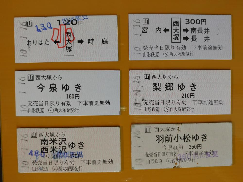 よく見ると6枚のうち3枚は料金改定直後のものと思われ、変更後の料金がスタンプで表示されているのも面白いところです。フェイスブックでも「鉄道きっぷ専科」というグループが活発な投稿を行っていますが、使用後の切符からもいろんなものが見えてくるようです。宮脇俊三の「時刻表昭和史」風に「長井線鋏痕鉄道史」が創作されるのを期待したいと思います。