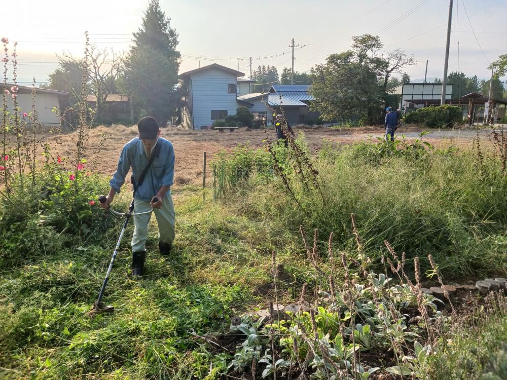 9月1日午前6時、駅の広場と花壇の草刈作業を行いました。広場の草は、腰の高さまで伸びていて、第1陣の除草剤に加えての掃討作戦です。その量たるや大変なもので、刈り取った草の処理もままならない状況です。