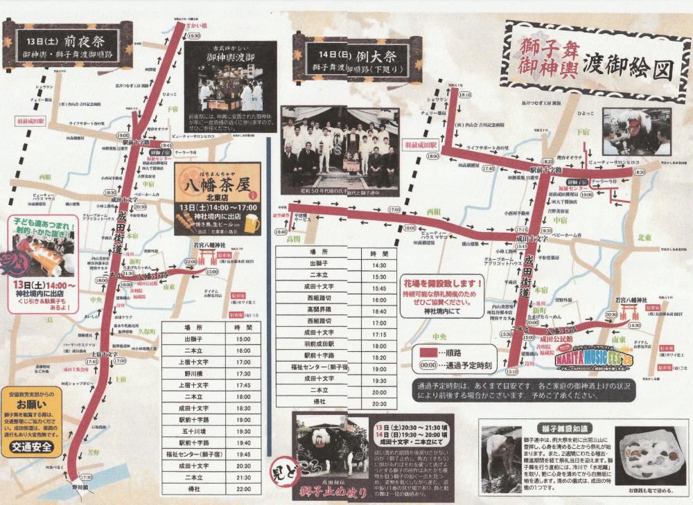 9月に入って、各地区で秋の例大祭が行われます。今週の土、日は隣の五十川地区。そして来週の13日(土)、14日(日)は成田八幡神社の御神輿・獅子舞の渡御が行われます。成田駅には14日の午後6時頃に到着予定です。