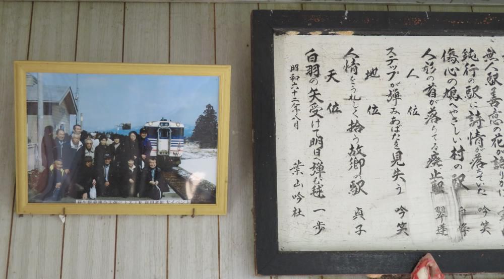 待合室に入ると昭和62年(1987年)8月の日付のある川柳の献額が飾られている。昭和62年は国鉄からJR東日本となった年であり、長井線が第3セクターとして存続する事が決定された年でもある。その中に次の句があった。「人形の首が落ちたる廃止駅」。句の作者は今の状況を見たら、どんな句を詠むのだろうか。