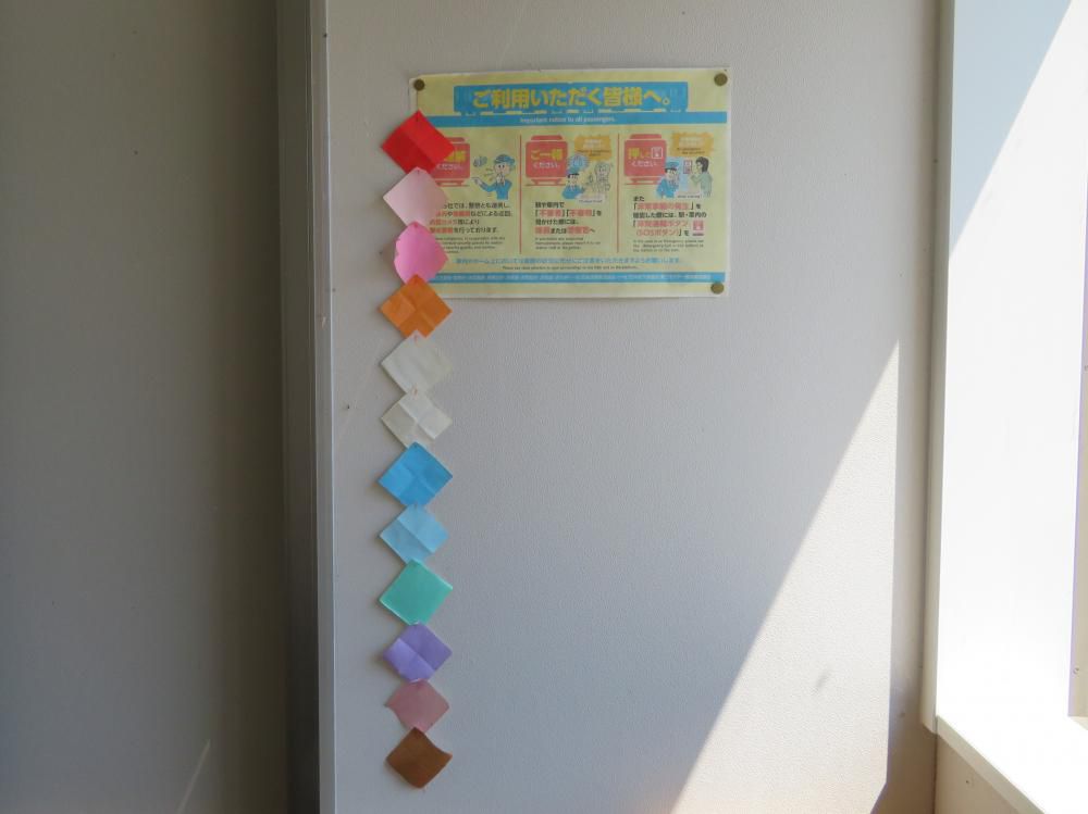 駅の中はとてもきれいだった。待合室に入るとJRからのお知らせなどが掲示されている。けれども長井線の駅には無人駅も含めて配置されている駅ノートなどは置かれていなかった。色紙を赤い糸で丁寧に繋いだ飾り物があった。いつからここに飾られていたのだろう。地元のご婦人が創ってくれたのだろうか。「この駅はJRのモノである」と思わせるような雰囲気の建物の中で、地元の人の姿が見えるような気がして、ホッとするものがあった。