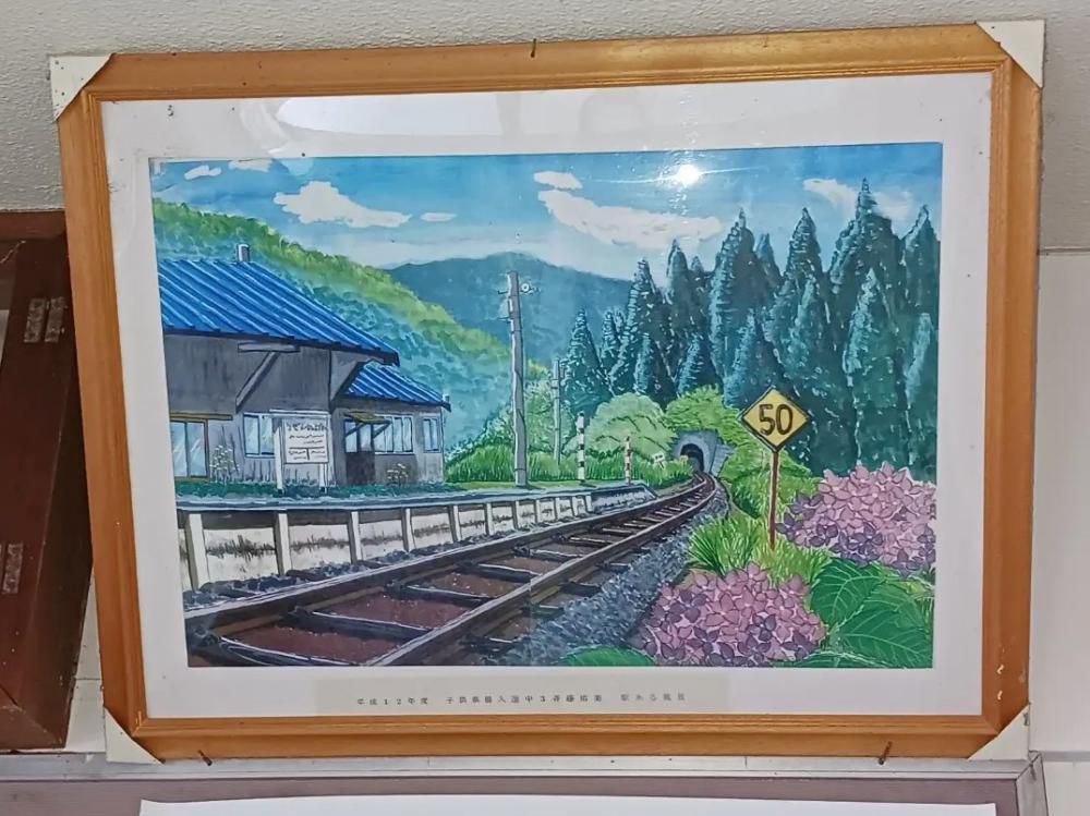 待合室には絵画も飾られていた。中学3年の女生徒の作品であり、「平成12年度子供県展入選作『駅ある風景』」とある。青い山々に囲まれた村の駅舎に、レールが此方と彼方をつなぎながら輝いている。