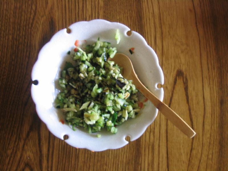 材料は太陽をいっぱいに浴びた夏の野菜をみじん切り(ありあわせのナスやきゅうり、しそやみょうがなど何でもOK、朝取りの新鮮野菜だったら更にOK)にして、それにしょう油で味付けするだけのシンプルなものですが、盆地特有の山形の暑い夏で、落ちた食欲を奮い立たせる一品です。