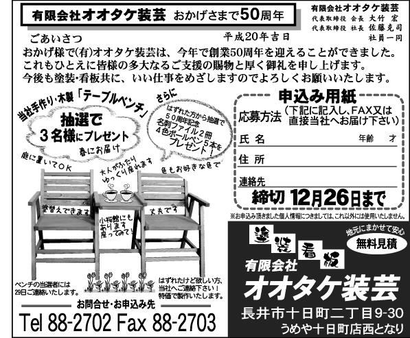 おかげさまで (有)オオタケ装芸は今年で創業50周年を迎えることができました。これもひとえに皆様の多大なるご支援の賜物です。そこで感謝の気持ちを形にと思い、なにかプレゼントをできるものをと考えました。ペンキでは煮ても焼いても食えないし、一般家庭に看板は必要ないし・・・そこで3年前から当社でオリジナルの木製のベンチを作り始めました。それをど〜んと3台プレゼントします。この木製ベンチのいいところは、天気のいい日、外でティータイムやバーベキューする時に、コーヒーやお菓子、ビールやお肉を置くテーブルがすぐ手元にあることです。子どもたちにとって高さもちょうどいい!また、結婚○○周年いつまでたっても二人で庭を見ながらお茶を呑んでラブラブに!いかがですか?