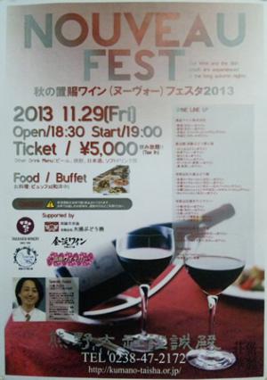 おらいも、この11月は中旬から下旬にかけ、4つのワインパーティーがあります。21日(木)は先日このブログでご紹介している、えくぼプラザでの『音楽とワインの夕べ』。24日(日)、中山町中央公民館での『すももワインパーティー』。29日(金)、宮内の熊野大社での『置賜ワインフェスタ』(画像参照)。30日(土)、宮内の蔵楽での『地酒と郷土料理の夕べ』。 おらいでもチケットお取扱いしているものもございますので、お気軽にお問い合わせ下さい(info@ourawine.com まで)。 公式HP 大浦ぶどう酒の商品 大浦ぶどう酒クーポン券(来店用) |