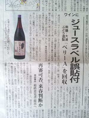 この度新聞、ニュース等で報道されました通り、弊社で製造しておりますストレート100%ジュース「ベリーAのジュース1,800ml 」(*賞味期限2013年10月のロット)のラベルを、同じ容器(一升瓶・茶色)に瓶詰めしております「山葡萄ワイン1,800ml」に、こちらの不注意で誤って貼り出荷したことが分かりました。
