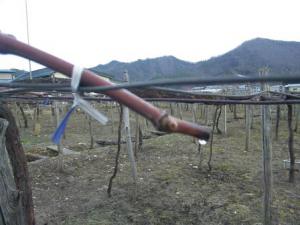 画像は、松沢地区の山崎さんのマスカット・ベリーAの畑。ぶどうの樹も長い冬眠から目覚め、春の訪れと共にぶどうの涙(樹液)が出てきました。水を吸い上げて樹の剪定した切り口部分から滴り落ちてきます。ぶどう畑の春の一コマです。