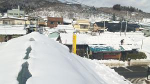 3月が近づいて雪も落ち着いた状況だったげんと、大荒れだった日曜日の雪がまた積もり、敷地内の雪もかなり溜まってきて、様々な作業に支障をきたす為、今日排雪を頼みました。その前に昨日は天気が良かったので、おらいの男衆で今年何回目かの雪おろし。屋根に上がると、昨日は雪おろし日和だったせいか、近所で雪おろしをしている人が目立ちました。遠くに見える烏帽子山もあと二ヶ月もすると千本桜が咲きます。