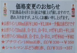 年々、資材類並びに原料ぶどうの価格が上がり、今までの料金での販売が大変難しくなりました。誠に恐れ入りますが、2013年4月1日より希望小売価格を下記の通りにさせて頂きたくお願い申し上げます。趣旨ご理解の上、今後ともご愛顧賜りますよう、よろしくお願い致します。 山形ワイン(赤)1,800ml *他の白(甘口)、白(辛口)、ロゼは現状価格です。 旧希望小売価格@1,943→新希望小売価格@2,100 山形ワイン(赤、白・甘口、白・辛口、ロゼ)720ml 旧希望小売価格@1,071→新希望小売価格@1,155 山形ワイン(赤、白・甘口、白・辛口、ロゼ)360ml 旧希望小売価格@641→新希望小売価格@683 プチワイン(赤、白)180ml 旧希望小売価格@330→新希望小売価格@350 シャルマンぶどう液(赤、白)550ml 旧希望小売価格@315→新希望小売価格@357 公式HP 大浦ぶどう酒の商品 大浦ぶどう酒クーポン券(来店用) |