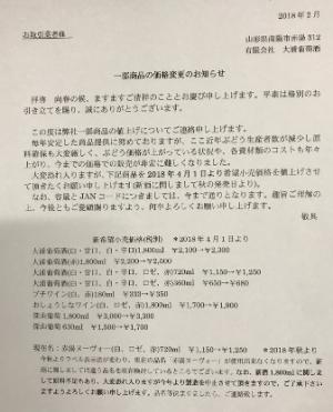 毎年安定した商品提供に努めておりますが、ここ近年ぶどう生産者数が減少し原料確保も大変厳しく、ぶどう価格が上がっている状況や、各資材類のコストも年々上がり、今までの価格での販売が非常に難しくなりました。 大変恐れ入りますが、下記商品を2018年4月1日より希望小売価格を値上げさせて頂きます(新酒に関しまして秋の発売日より)。 趣旨ご理解の上、今後ともご愛顧賜りますよう、何卒よろしくお願い申し上げます。 新希望小売価格(税別) *2018年4月1日より 大浦葡萄酒(白・甘口、白・辛口)1,800ml ¥2,100→¥2,300 大浦葡萄酒(赤)1,800ml ¥2,200→¥2,500 大浦葡萄酒(白・甘口、白・辛口、ロゼ、赤)720ml ¥1,150→¥1,250 大浦葡萄酒(白・甘口、白・辛口、ロゼ、赤)360ml ¥650→¥680 プチワイン(白、赤)180ml ¥333→¥350 おしょうしなワイン(白、ロゼ、赤)1,800ml ¥1,700→¥1,900 深山葡萄1,800ml ¥3,000→¥3,300 深山葡萄630ml ¥1,500→¥1,700 公式HP 大浦葡萄酒の商品 |
