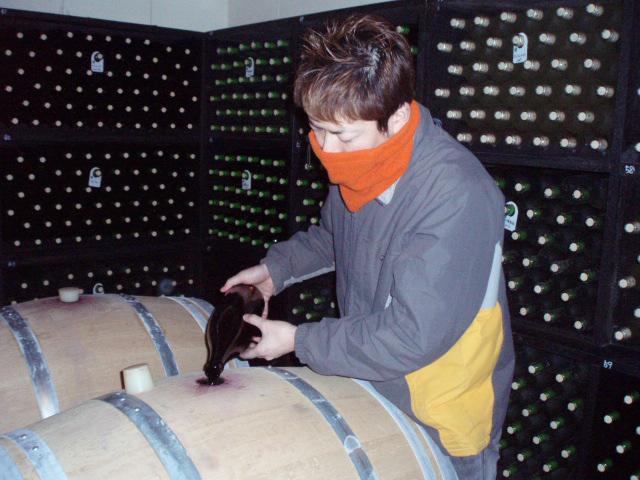 今日は、樽熟成のワインの目減りした分を補充して満タンにする作業をしてました。